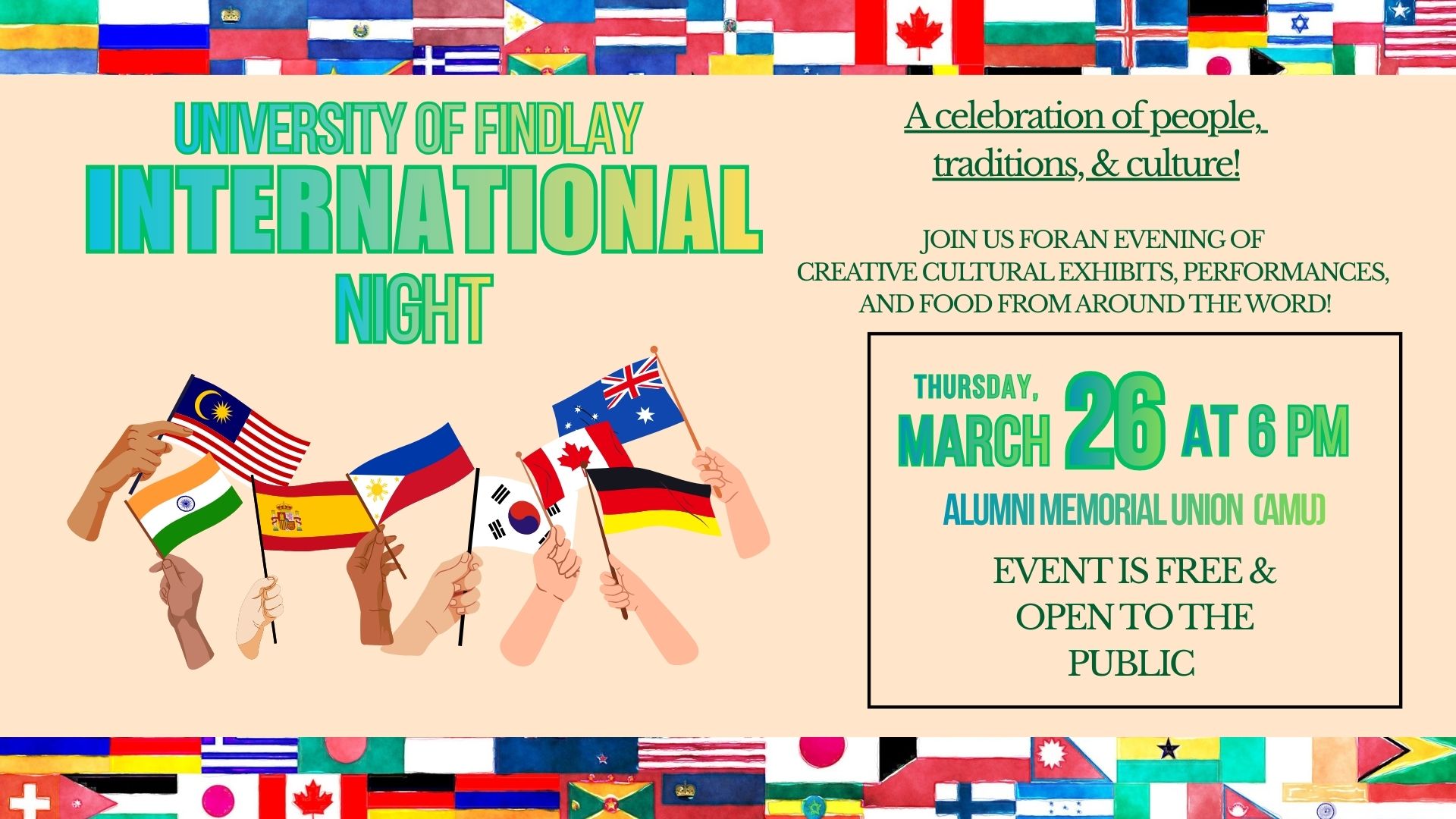 Join us for the University of Findlay’s International Night on March 26, 2026 at 6PM in the Alumni Memorial Union. This event is free and open to the public. Enjoy different cultures from across the globe as they share their cuisine, arts, exhibits, and performances!